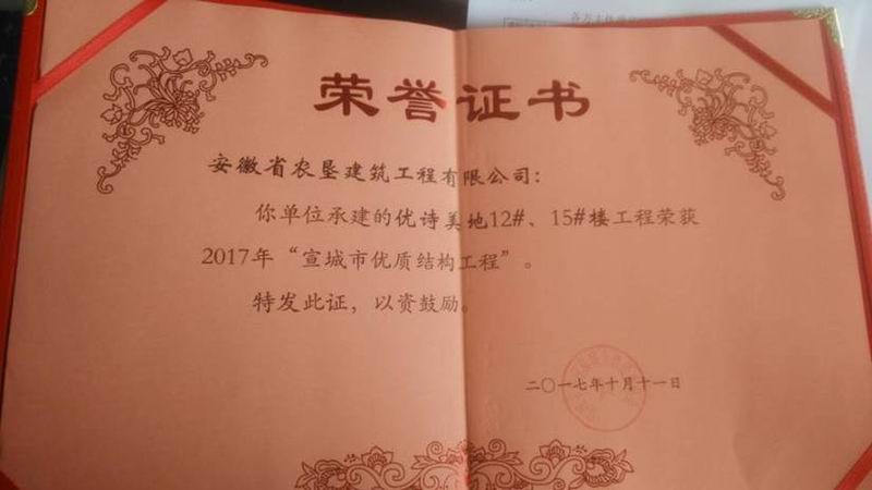 近日,安徽垦建公司承建的优诗美地项目12#、15#楼盘被评为2017年“宣城市优质结构工程”。