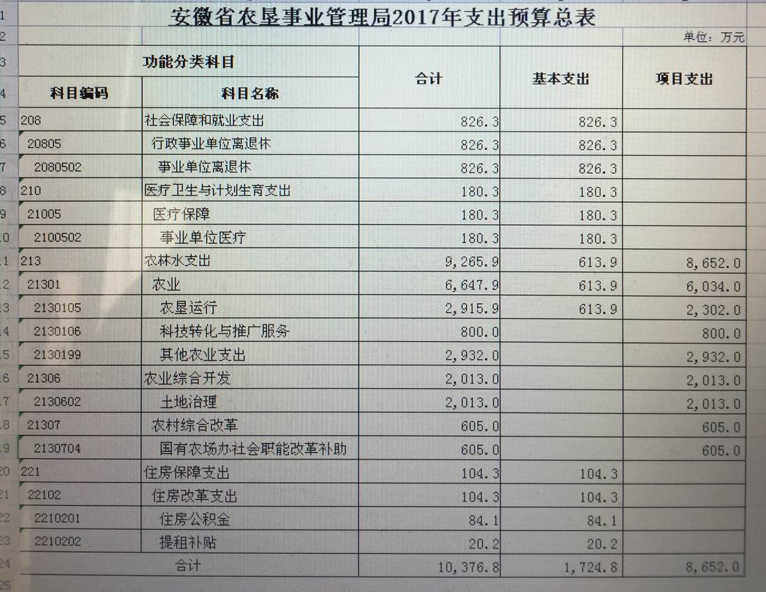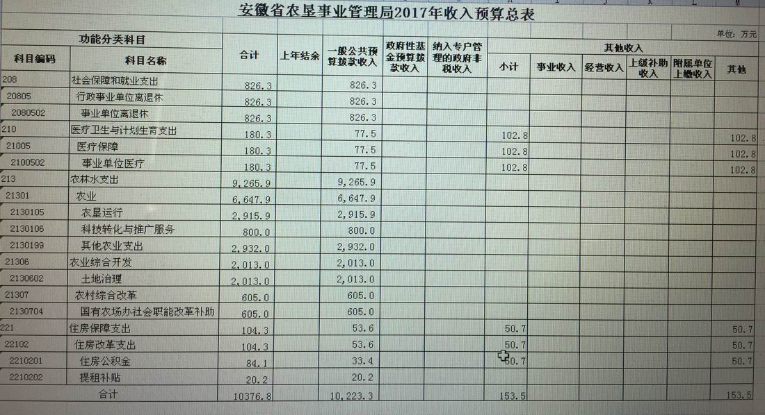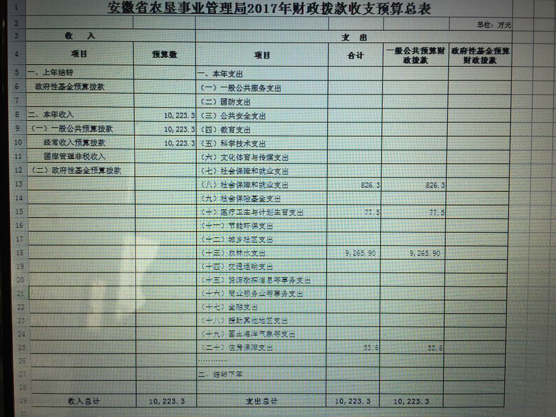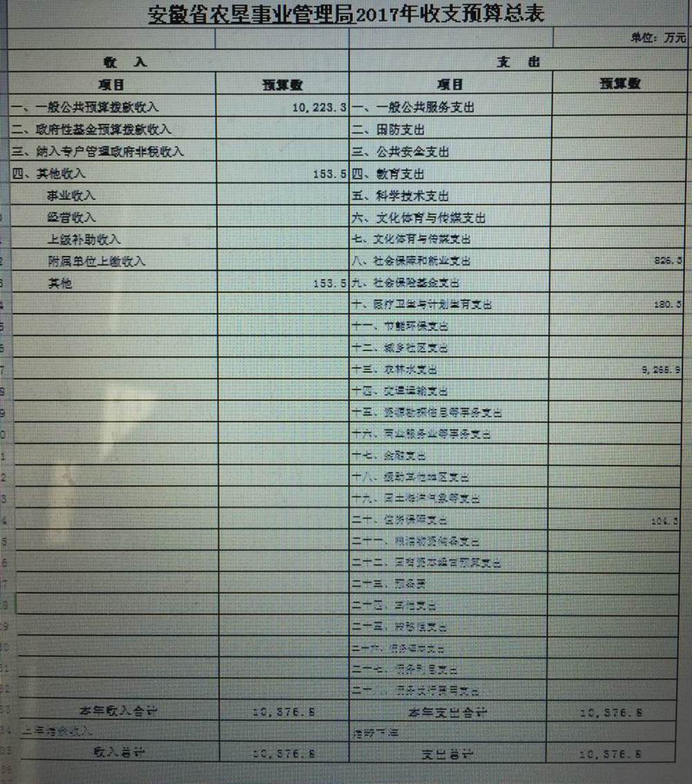 按照综合预算管理的原则,安徽省农垦事业管理局所有收入和支出均纳入部门预算管理。安徽省农垦事业管理局2017年收支总预算10,376.8万元,收入来源为:一般公共预算拨款收入、其他收入;支出包括:农林水支出、社会保障和就业支出、医疗卫生与计划生育支出、住房保障支出。