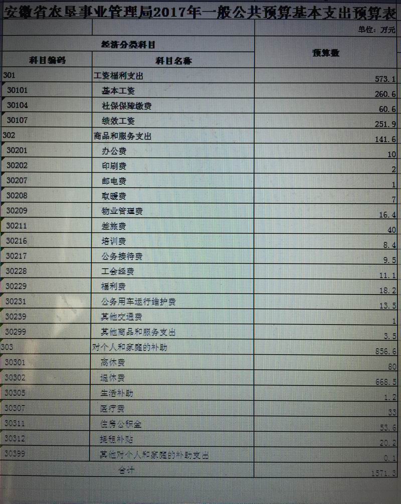 安徽省农垦事业管理局2017年一般公共预算基本支出1,570.3万元,其中:工资福利支出573.1万元,主要包括:基本工资、津贴补贴、奖金、社会保障缴费、绩效工资、其他工资福利支出等。商品和服务支出141.6万元,主要包括:办公费、印刷费、咨询费、手续费、水费、电费、邮电费、物业管理费、差旅费、维修(护)费、会议费、培训费、公务接待费、劳务费、工会经费、福利费、公务用车运行维护费、其他交通费等。对个人和家庭的补助856.6万元,主要包括:离休费、退休费、生活补助、医疗费、住房公积金、提租补贴等。
