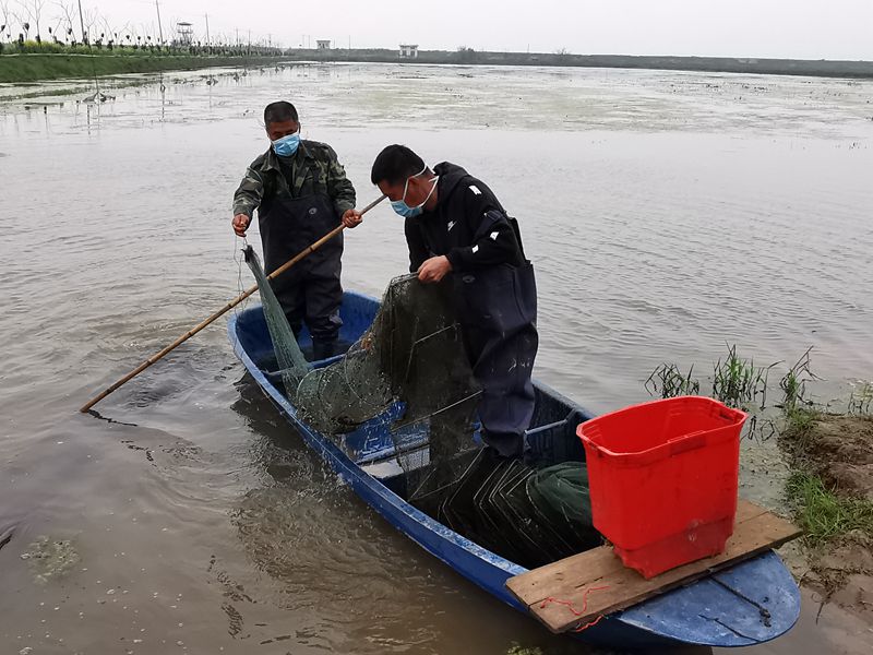 3月27日,在农垦华阳河农场稻渔综合种养万亩标准化示范基地,稻虾种养大户陈多四撑着小船在虾塘里捕捞虾苗。陈多四说:“受疫情影响,今年本地的小龙虾虾苗难卖,价格又低,幸亏有农场帮我们联系,这两天出了两批虾苗,总共卖了800多斤。”当地像陈多四这样的稻虾种养户对成虾市场更加关注,虾苗暂时遇冷,今年的成虾会有一个好收成吗?