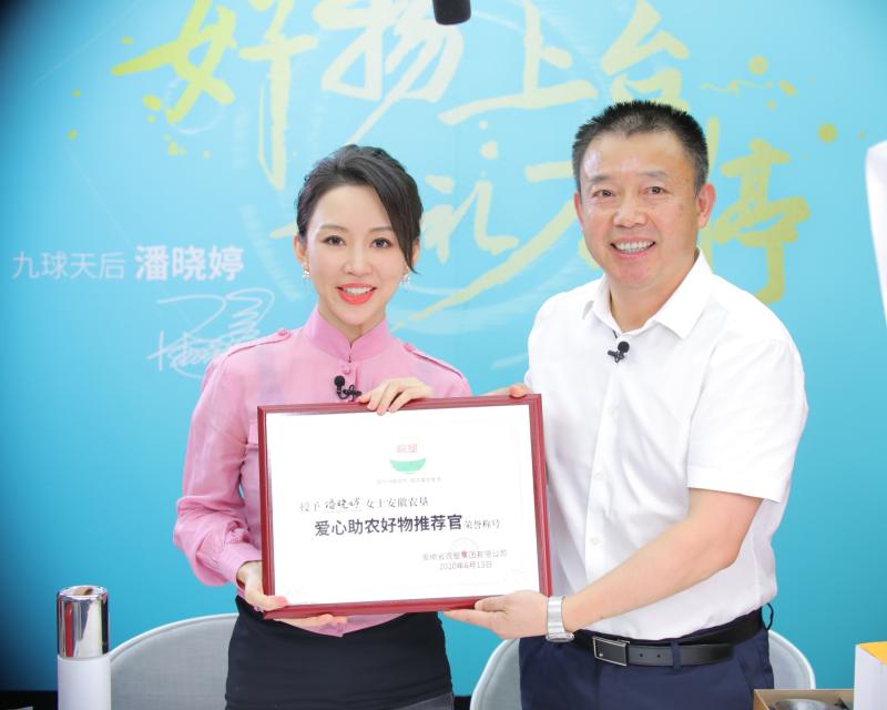 6月13日,“九球天后”潘晓婷在抖音平台进行了个人直播首秀,农垦集团公司副总经理董建平做客直播间介绍开云手机在线登录入口集团和皖垦品牌情况,向潘晓婷女士赠送了敬亭绿雪茶叶,并向其颁发了“爱心助农好物推荐官”证书。集团公司战略发展部负责人在直播间同潘晓婷女士一同向广大网友粉丝推介皖垦优质农产品。