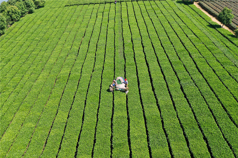 眼下,皖垦茶业集团大宗茶园进入采摘旺季,茶农们操作采茶机在一排排茶垄间来回穿梭,茶叶纷纷飞进机器后面的集叶袋。目前,已完成大宗茶机采面积1.5万亩。整个大宗茶机采全年分为四轮,最后一轮将在9月底前全面结束。