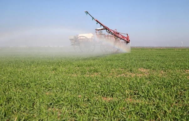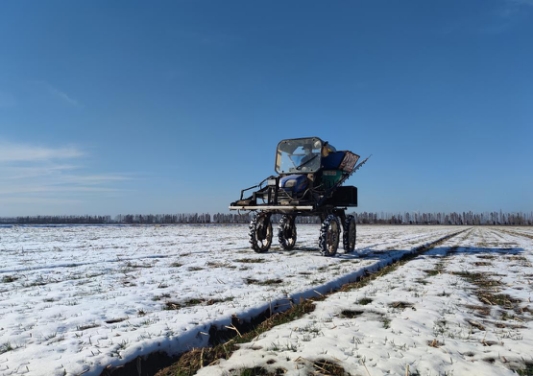 2月16日,华阳河农场农机手驾驶大型植保机械进行小麦喷肥施药作业。(李龙 摄)