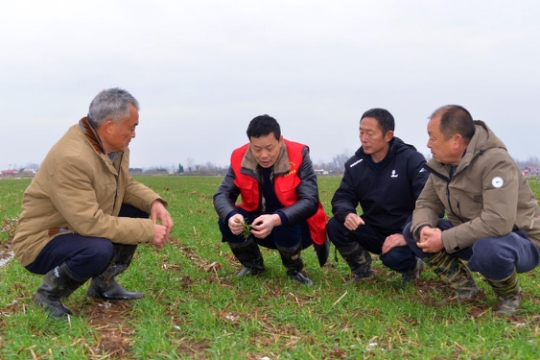 2月23日,农业技术员深入田地查看苗情,实地开展春季田管技术指导服务(薛晓旭 摄)