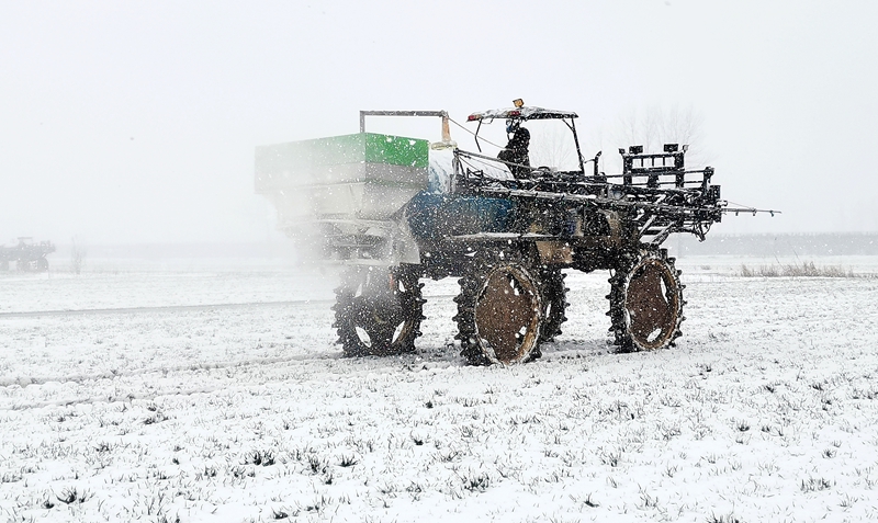 2月24日,龙亢农场公司组织职工利用高地隙植保机在五河县头铺镇托管田块开展追施小麦返青肥作业。薛勇 摄