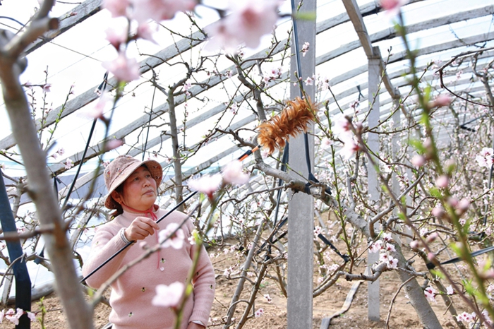 早春时节,砀山果园场公司近1000亩大棚桃花盛开,正是大棚桃花授粉的关键时期,职工正抢抓农时,为桃花授粉。农技人员深入大棚果园现场了解棚内温度、湿度,讲解人工授粉技巧,并引导果农采用生物防虫、防病技术,提高油桃坐果率和果实品质,提升果树的经济效益。(郭茜 供稿)