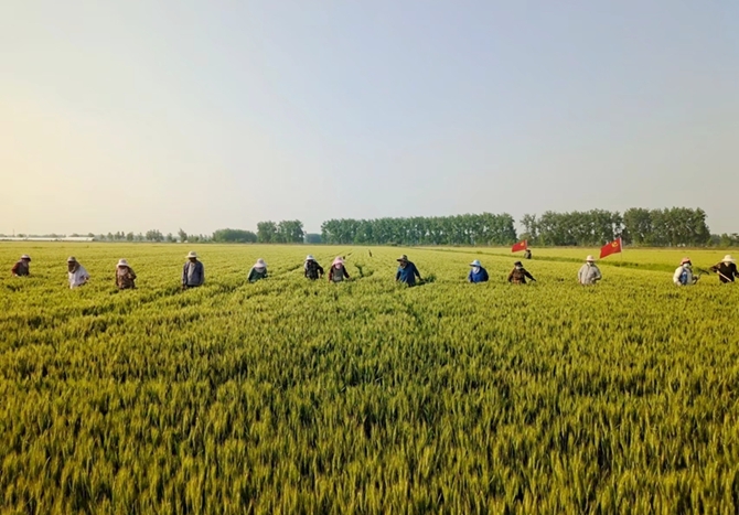 5月7日,在潘村湖农场公司第三农业分公司统一经营田,党员管理人员正带领职工群众开展麦田去杂作业。