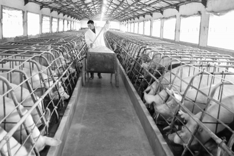 安徽水家湖农场系国家生猪活体储备基地场。为保障生猪产品质量安全,农场对引进的饲料进行严格的检验,根据生猪的不同生长期,在疾病预防、保健、治疗上严格遵守国家相关规定,宰前进行药物残留及兴奋剂等违规添加剂检测。图为农场工作人员在标准化猪舍里饲喂生猪。(鲍广云 黄双成摄)