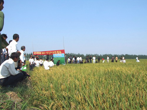 观摩团一行深入龙亢农场“绿旱一号”试验田、生产示范田进行实地观摩,听取了场农科所对该品种水稻的生长特性的介绍,并现场观摩该品种的长势及表现,并经现场测产核实,“绿旱一号”平均亩产达580公斤。