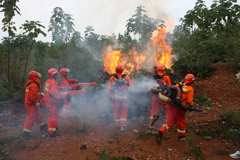 九连山茶场森林扑火专业队现场举行了森林火灾扑救演练,10多名扑火队员接到指令后,立即携带背负式灭火机、高压水泵及移动蓄水池奔赴预设火灾现场,经过快速安装启动,10分钟后将火情彻底扑灭,充分展示了快速反应、操作精准的过硬素质和本领。