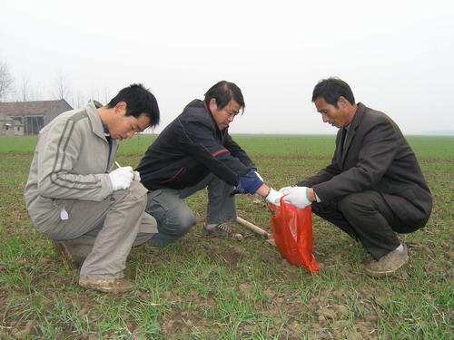 2005年午季,地处淮河之滨的潘村湖农场部分田块发生罕见的小麦吸浆虫灾害,当年有数百亩小麦减产幅度很大。2006年,该场在省市植保部门的指导下,制定了周密的防治方案,有效地遏制了小麦吸浆虫的爆发态势,全场3.2万亩小麦平均单产历史性地达到940斤。为彻底根除小麦吸浆虫,从11月底开始,该场组织农技人员在全场80多块条田挖取土样近500份,按有关技术规程进行淘土调查以确定虫情,制定相应的防治措施。图为12月5日上午,农场技术人员正在一分场大田采取土样的情景。(杨登宏摄) | |