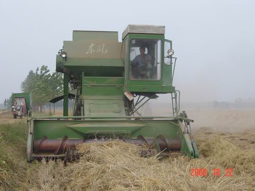 眼下,大圹圩农场正集中力量,人机并举,全力以赴加快水稻晒割脱粒进度。 图为:割晒机在田间割晒水稻和“东风”收割机对已晒干稻把进行捡拾脱粒的场景。