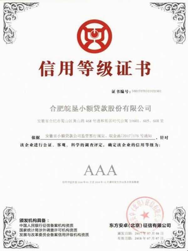 近日,安徽省金融办公布全省小贷行业二年一度的企业信用评级结果,皖垦小贷股份有限公司继2013年、2015年之后,2017年连续第三次荣获最高等级AAA级。