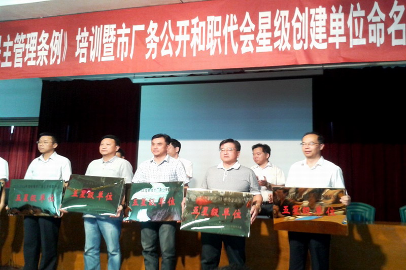 近年来,皖垦食品集团工会有组织、有计划、有步骤地推进场务公开民主管理工作,成立领导小组,制定实施方案,明确目标任务,各项工作举措落实到位。今年继荣获蚌埠市“2013年度厂务公开民主管理先进单位”之后,日前,又被市总工会授予“2013-2014年度全市厂务公开和职代会五星级单位”荣誉称号。(李峰)