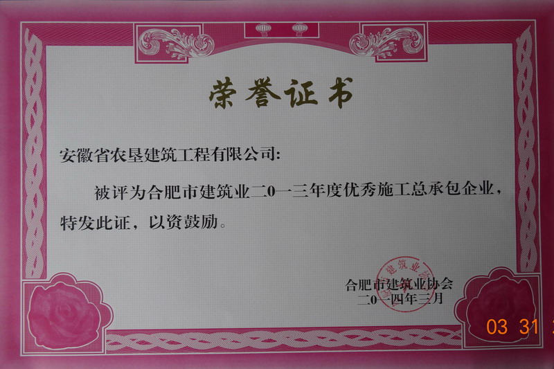 3月28日下午,合肥市建筑业协会举行常务理事会暨理事大会,表彰了2013年度全市建筑行业优秀企业及单项先进。垦建公司获评“优秀施工总承包企业”、“统计管理先进企业”两项殊荣,项目经理苏芳芳荣膺安全管理先进个人。
