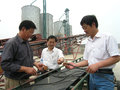 午收在即,全国种子项目区——安徽省潘村湖农场已做好午收夏种各项准备工作。目前,全场即将投入“三夏”战役的各种机电设备已全部检修保养完毕并通过场安委会验收。图为5月27日上午,场安委会检查组正在夏粮收购点检查机电设备的情景。( 杨登宏摄)