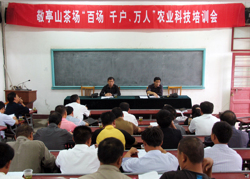 “百场、千户、万人”农业科技培训会由陈雪松副场长主持,场生产科长汪益清就实施《敬亭山茶场万亩高产优质高效茶园综合配套技术方案》作了专题讲座。