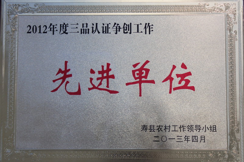 近日,寿县农村工作领导小组授予正阳关农场“2012年度三品认证争创工作先进单位”称号。