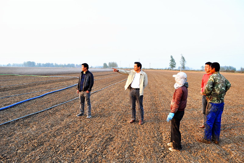为积极应对今年秋种以来多日无雨的不利天气,连日来,潘村湖农场广大职工家庭农场在农技人员指导下,积极开展灌溉作业,力保秋种小麦一播全苗,为实现壮苗越冬打好基础。图为场长柏华胜10月22日在生产一线检查指导灌溉工作的情景。(杨登宏)